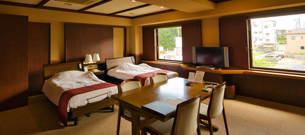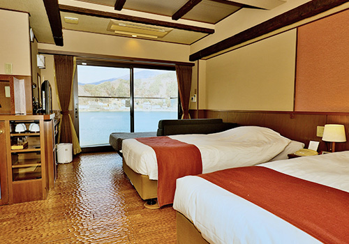 - 構成:ツインベッド(リクライニングベッド)、収納ベッド×2、河口湖温泉の引き湯風呂、座シャワー、トイレ