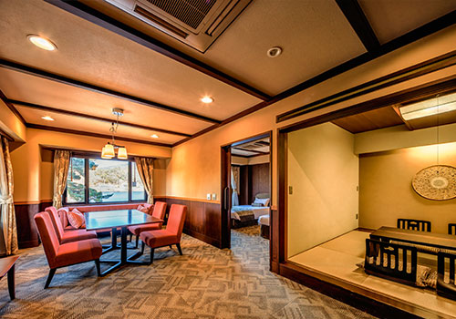 スイート![]() ![]() | 【広さ】45㎡ 【定員】4名 【土足】NG (入口で脱ぐ) | ♥8畳の畳敷きに2ベッド ♥リビングにソファベッド×2 |